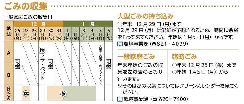広報ねやがわ12月号に年内のごみ収集についての記載がありまして、最終日は12月30日の可燃ごみということがわかります。12月31日〜1月4日は一般ごみの収集はお休み。