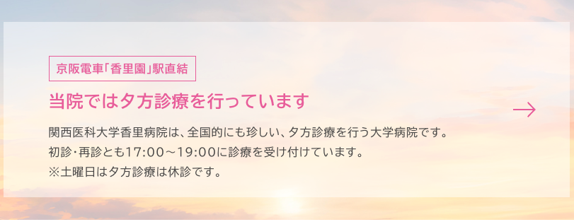 同じ関西医大の附属病院(枚方市)と総合医療センター(守口市)は外来の受付が午前中のみなので、香里病院は通院しやすいのではないでしょうか。