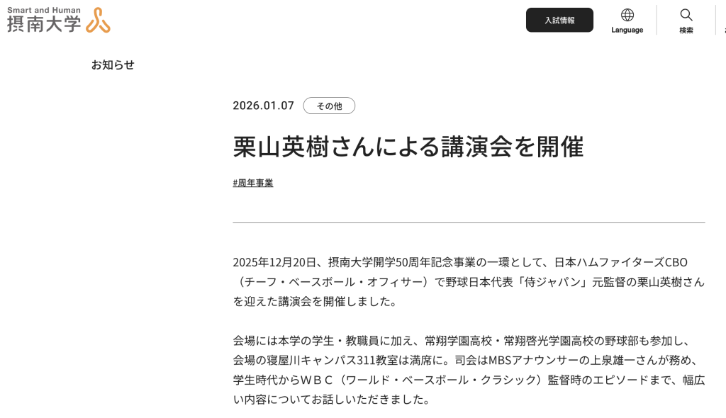 摂南大学の公式サイトを見ると、2025年12月20日に栗山英樹さんを迎えた講演会が開催されたことがわかります。