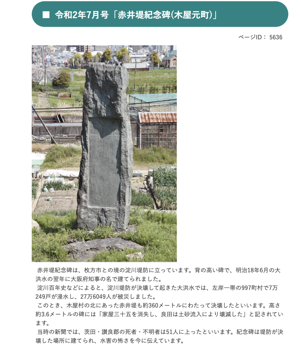 赤井堤紀念碑は淀川堤防が決壊して起きた大洪水のあとに建てられた紀念碑だそうで、寝屋川市役所のHPに解説がありました↓