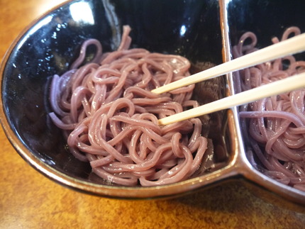 「電ツ~うどん」は、大阪電気通信大学工学部基礎理工学科の学生が開発した、うどんに付属のユズ酢をかければ紫色からピンク色に変化するという一品です。