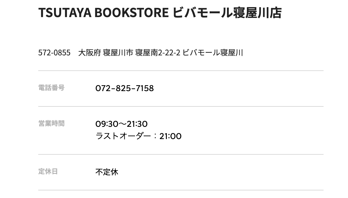 スターバックス TSUTAYA BOOKSTOREビバモール寝屋川店:9:30-21:30