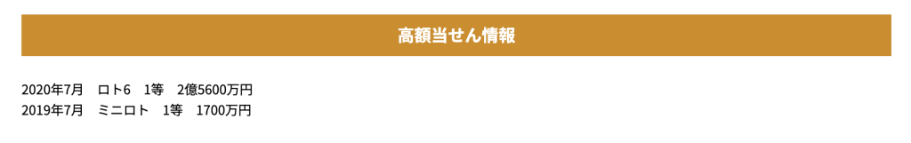 つづいてクイズの答えとして参照しているのは公式サイトに「高額当せん情報」と記載された部分のみです。「売場紹介」のコーナーで紹介されている部分についてはノーカウント。