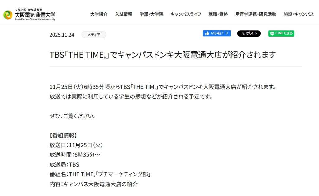 上記によると、「THE TIME,」 でキャンパスドンキ大阪電通大店が紹介されたことがわかります。