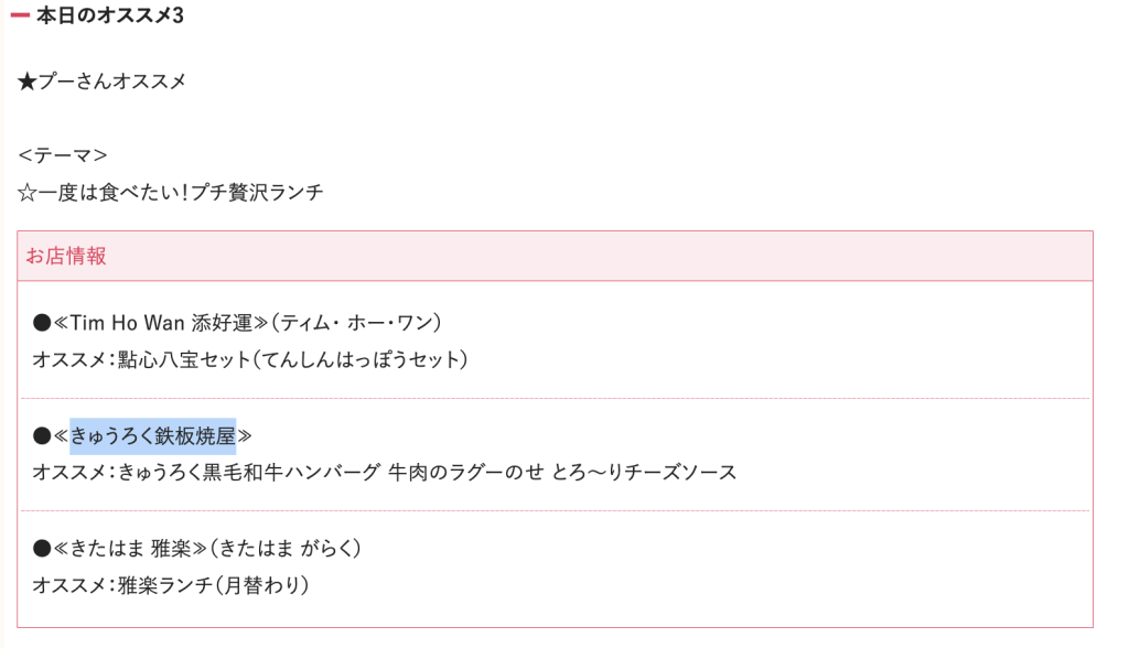 きゅうろく鉄板焼屋が紹介されたのは、「本日のオススメ3」のコーナー。関西代表グルメブロガー「プーさん」が、『一度は食べたい!プチ贅沢ランチ』として紹介していました。