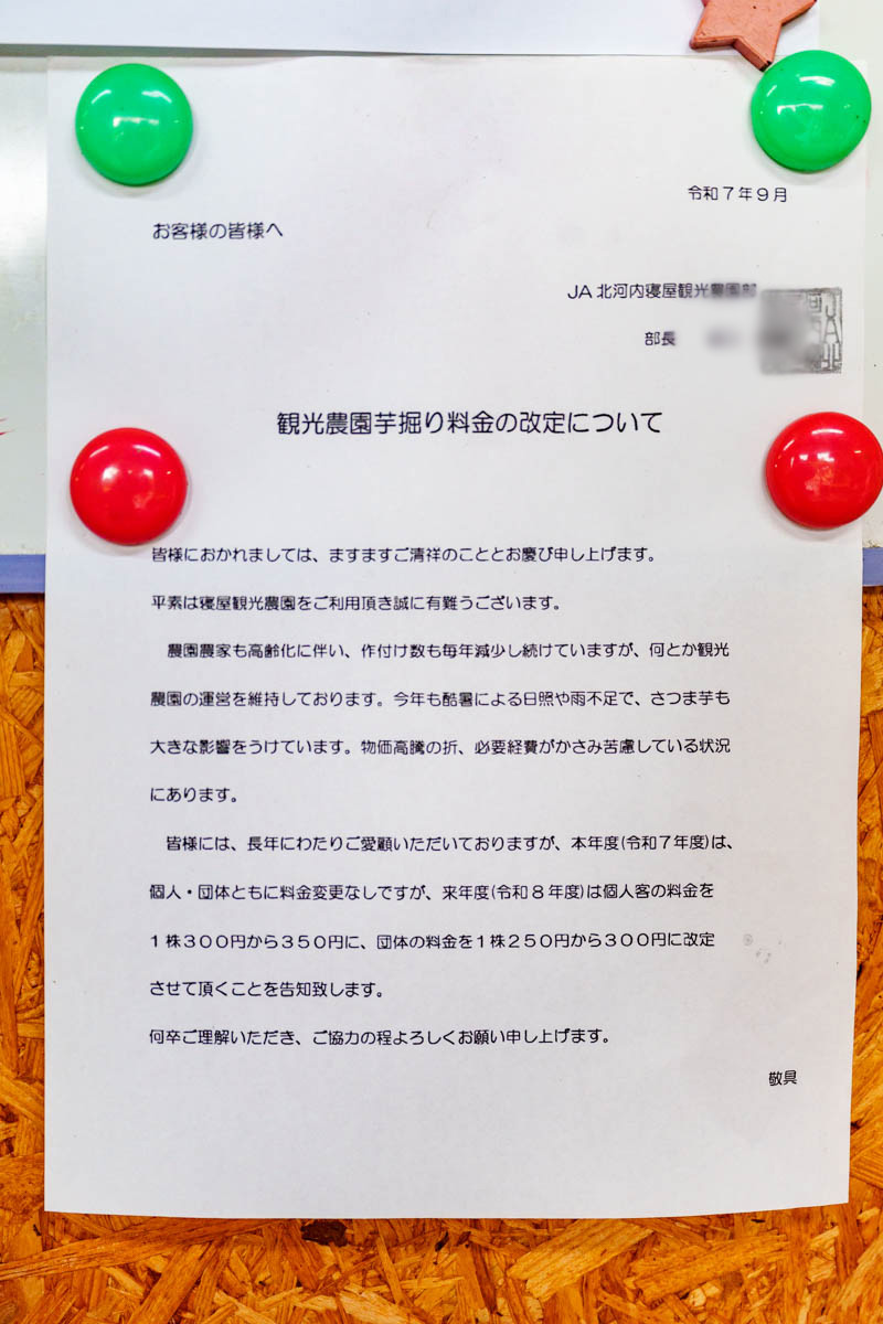開催期間は9月20日~11月3日なのですがお芋がなくなり次第終了でして、取材に行った時点であと僅かだったのでもう残ってない可能性が大。なのでこの記事は来年以降の参考にしてもらいつつも、どうしても今年気になる方は事前に電話で確認してみては。
