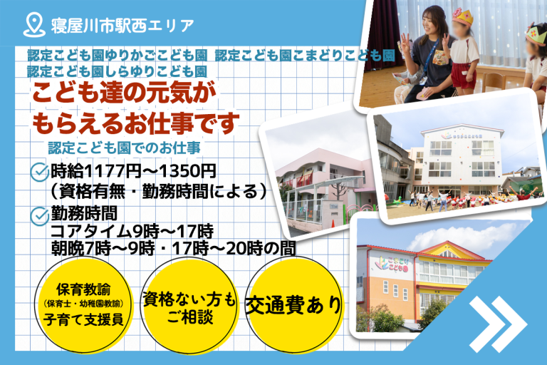 こども達の元気がもらえるお仕事です 認定こども園でのお仕事です。保育教諭(保育士)と一緒にこどもたちの保育や保育補助、0歳~5歳までの可愛いこどもたちの笑顔と元気がもらえるお仕事です 【募集職種】認定こども園でのお仕事 […] -