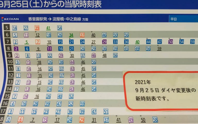 京阪電車の時刻表のデザインが変更されてる!駅名改称で。4か月以上気がつかなかった