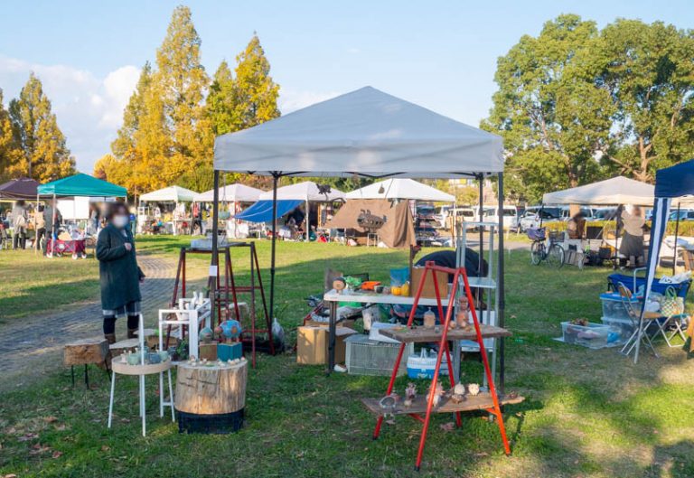 11/14(日)に開催された「ポケットマルシェ in 深北緑地」の様子。秋が深まる緑地内にハンドメイド&クラフトのお店などが並んでた