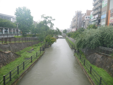 寝屋川市駅前の寝屋川が増水してた。未明からの激しい雨で