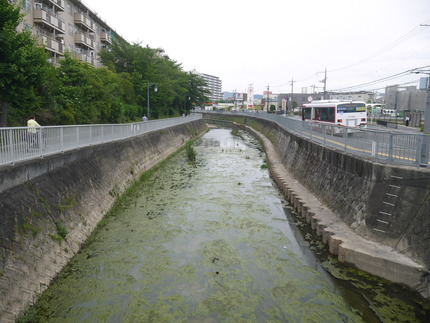 雨上がりで増水する池の瀬町の寝屋川。水がザ~と流れてた
