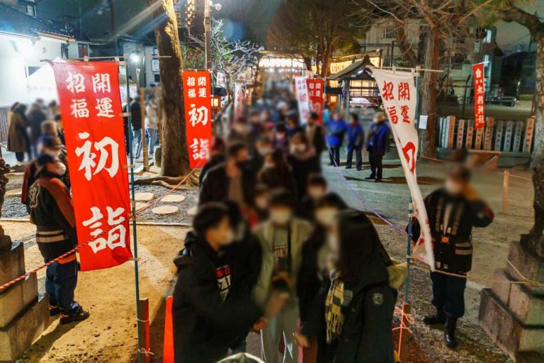 2021年を迎えた直後の大利神社の様子。初詣客が境内に並んでる。