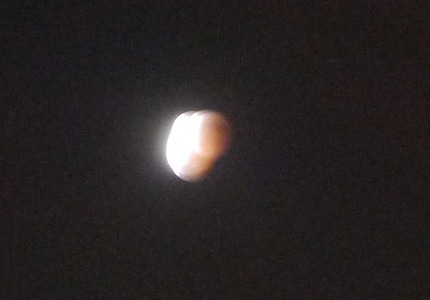皆既月食が寝屋川市内で観測されるのは2014年10月以来、約半年ぶりです。前回は皆既月食の時間が約1時間と長かったのに対し、今回は約12分と短め。