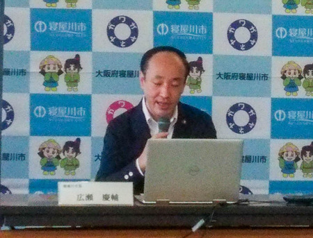 寝屋川市(広瀬慶輔市長、市川克美副市長、まちづくり推進部長)の3人です。