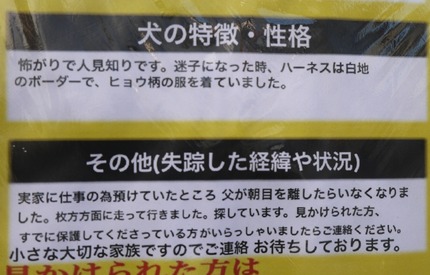 チラシによると、行方不明になっている犬は雑種のオス(5歳6か月、体重は約4kg)で、怖がりで人見知りの性格とのことです。