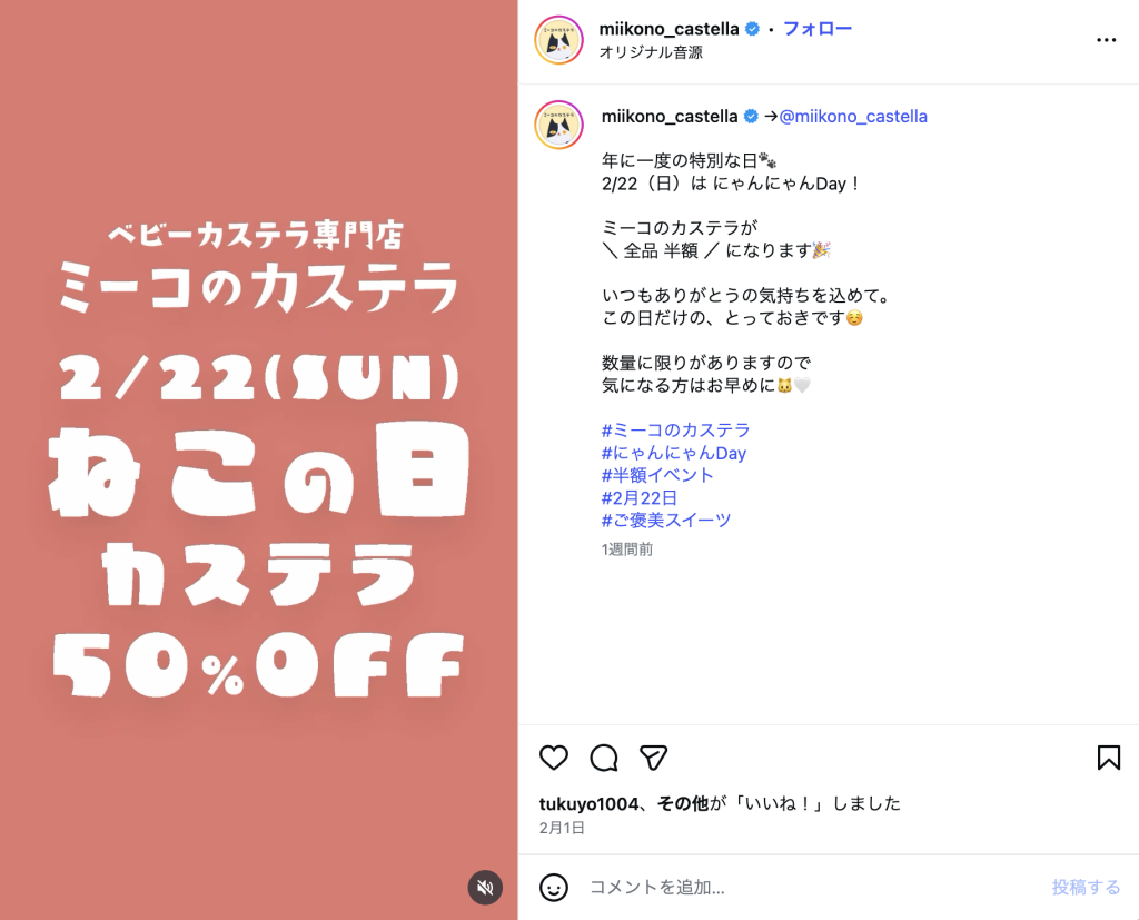 投稿を見ると、2月22日は「ねこの日」ということで、ミーコのカステラが全品半額になるようです。