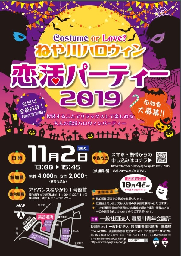 一般社団法人寝屋川青年会議所(ねや川JC)が11月2日(土)にホテルニューコマンダーで「ねや川ハロウィン恋活パーティー2019」を開催すると発表しました。