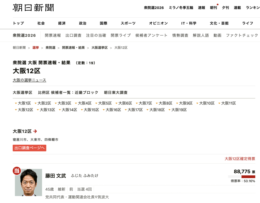 衆議院選挙2026・大阪12区(寝屋川・四條畷・大東)は藤田文武氏が当選。投票率55.23%