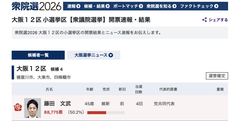 2月8日に実施された衆議院選挙2026・大阪12区(寝屋川・四條畷・大東)の開票結果です。