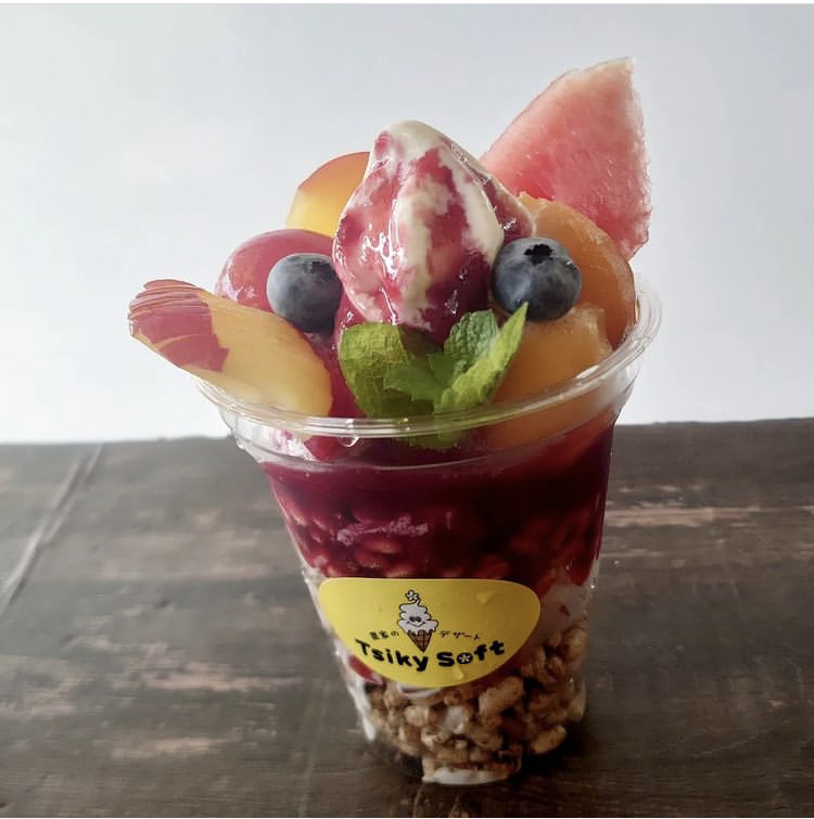 人気メニューの『農家のパフェ』はソフトクリームと旬フルーツ、ポン菓子を使ったパフェです。