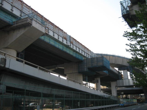 Bランプとモノレールの間は更にDランプの橋げたが来るので、かなり複雑な構造になります。