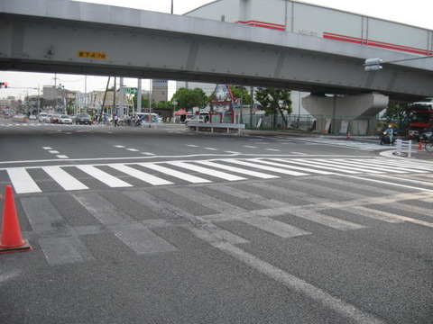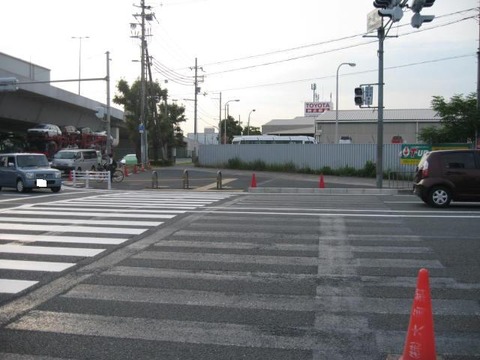 全国的に交差点のコンパクト化が実施されており、寝屋川市内ではここと交差点の雰囲気が似ている石津元町交差点でも確認できました。交差点のカーブの半径を急にして、車両が曲がるスピードを抑制する工事も同時に行われることが多いようです。