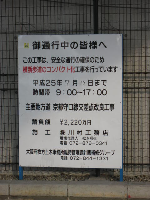 府道京都守口線と鳥飼仁和寺大橋へ向かう道路が交わる交差点です。何年か前に立体交差化工事が完了しました。(確か第二京阪道路の開通に関連した工事だったはず。地下には大雨の時に役立つ雨水貯留槽があるそうです。)