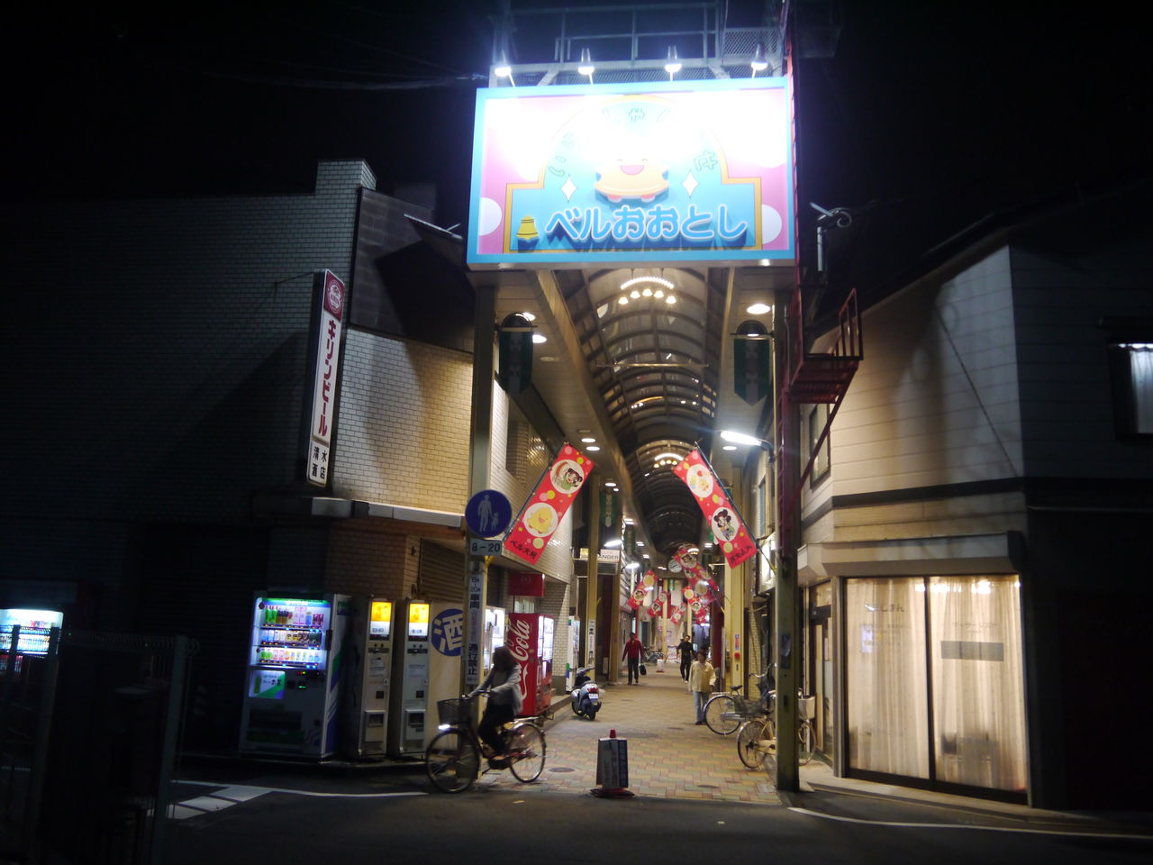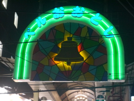 ベル大利のマスコットキャラクターは、「ベルちゃん」と「としちゃん」のコンビです。3つ目の入口となる寝屋川市駅側の看板はどうなっているのか確認してみると、以前と同じベルをかたどったデザインでした。