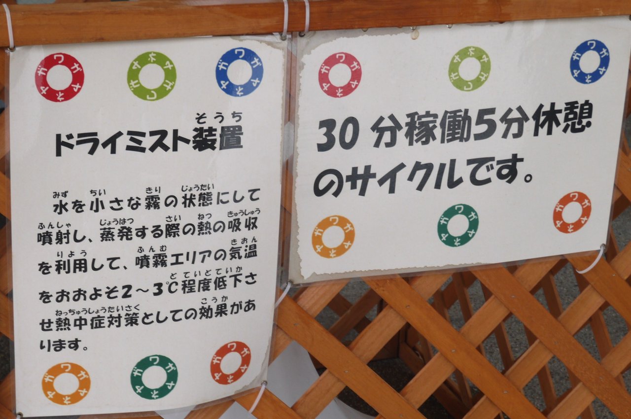 単に霧状の水がかかって涼しいだけでなく、実際に気化熱(水が蒸発する際の熱の吸収)の原理で周囲の気温が2~3℃下がるのだそうです。