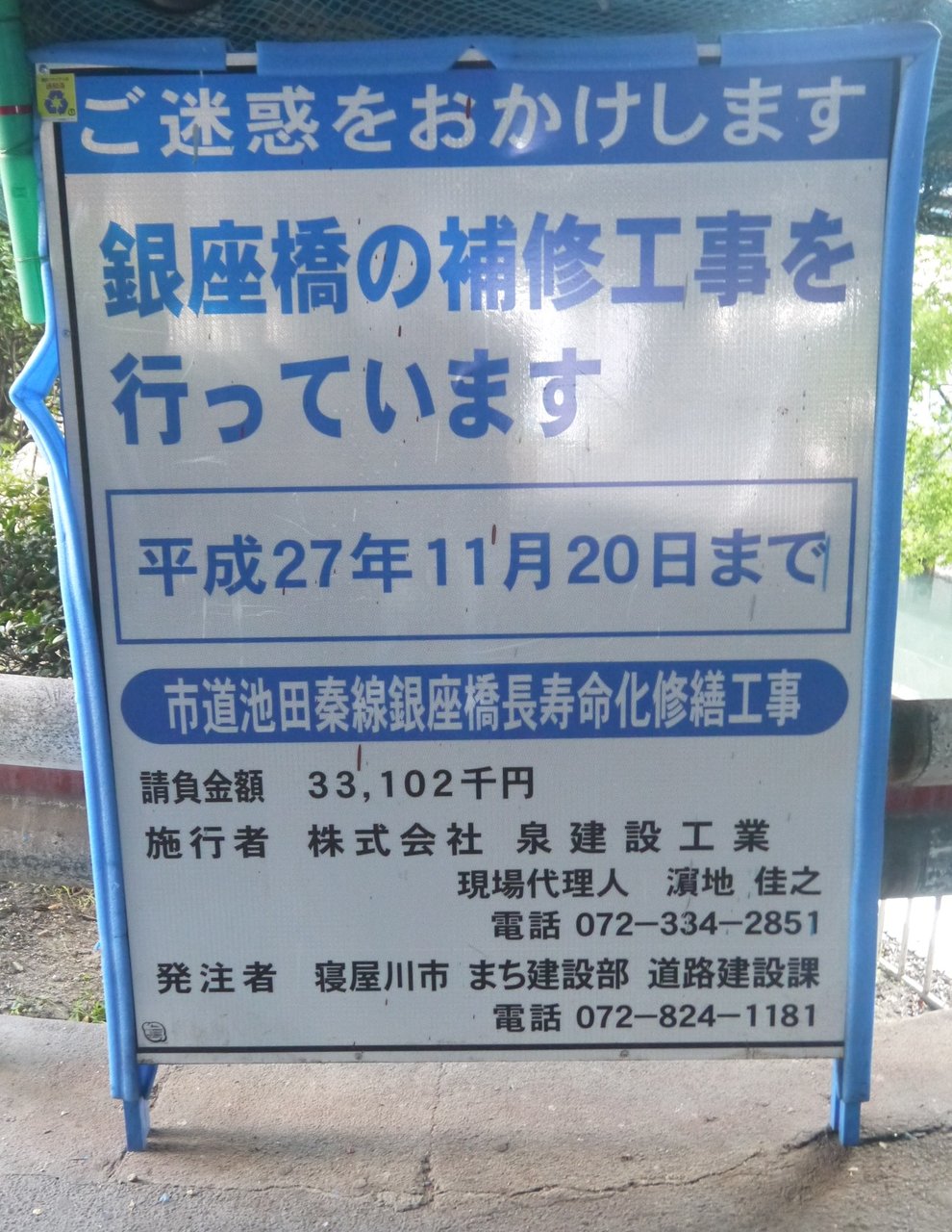 銀座橋は寝屋川市のメインストリート・市道池田秦線に架かる交通量の多い橋で、補修対象になったようです。