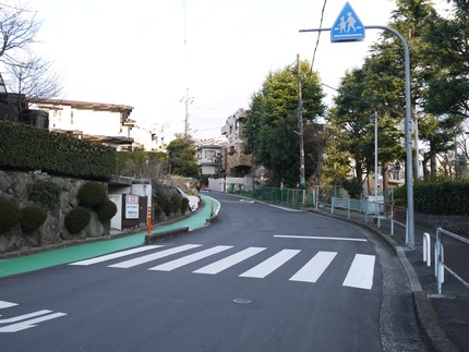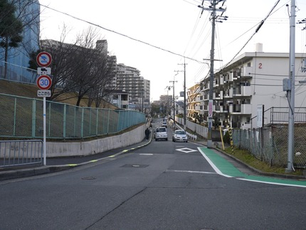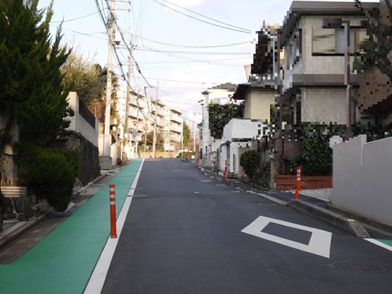 このカラー舗装はグリーンベルトと呼ばれていて、この交差点から三井が丘バス停前まで続いていました。
