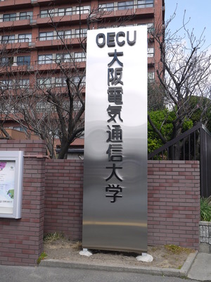 大阪電気通信大学寝屋川キャンパスの正門前に、メタリックな校名の看板が登場していました。