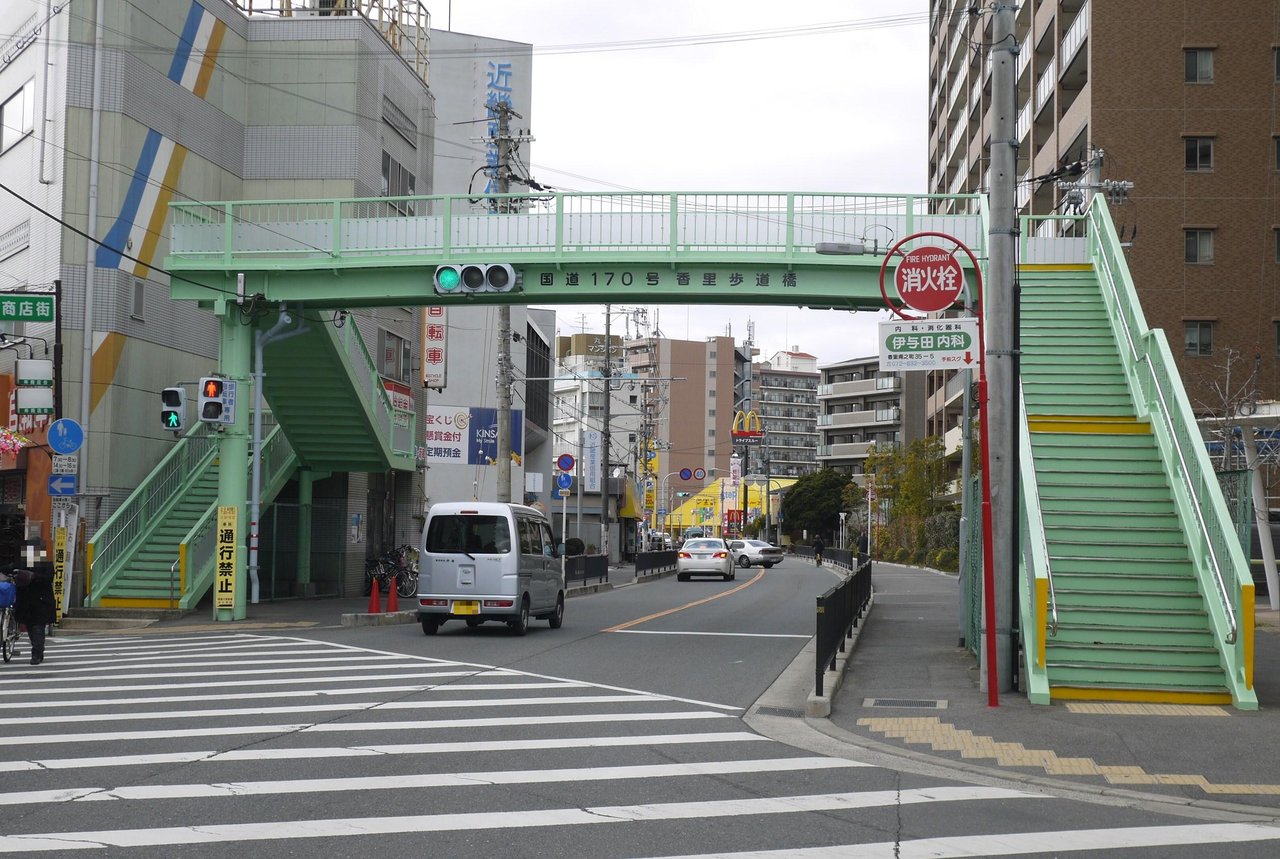 寝屋川市やその周辺では、老朽化した歩道橋を撤去する動きが出始めています(秦八丁交差点や金田町2丁目、4丁目交差点など)が、こちらの歩道橋は修繕して維持されました。