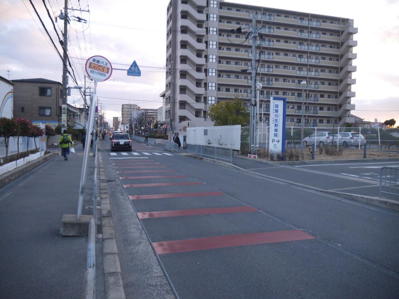 北幼稚園の正門前(寝屋川生野病院のバス停前)に横断歩道があるのを注意喚起する狙いがあり、描かれたペイントの数は約10本ずつ。車が通ると、軽い振動もドライバーに伝わる感じです。
