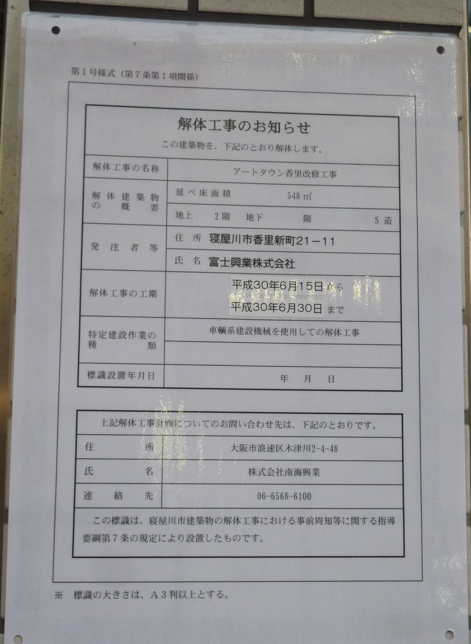それによると、解体工事の名称は「アートタウン香里の改修工事」で、工事の期間は6月15日から6月30日までの約2週間。
