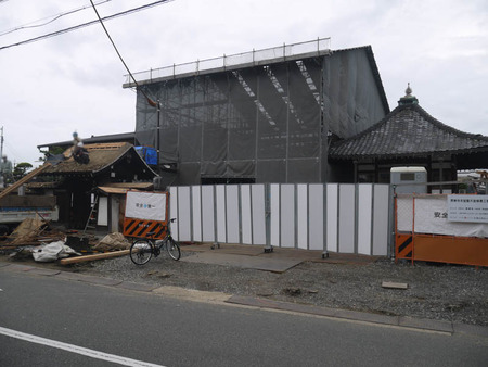 長栄寺では本堂(聖天堂)を大きな建屋で覆う修復工事が長期間続いていますが、最近になってから塀などの解体工事に着手した模様です。