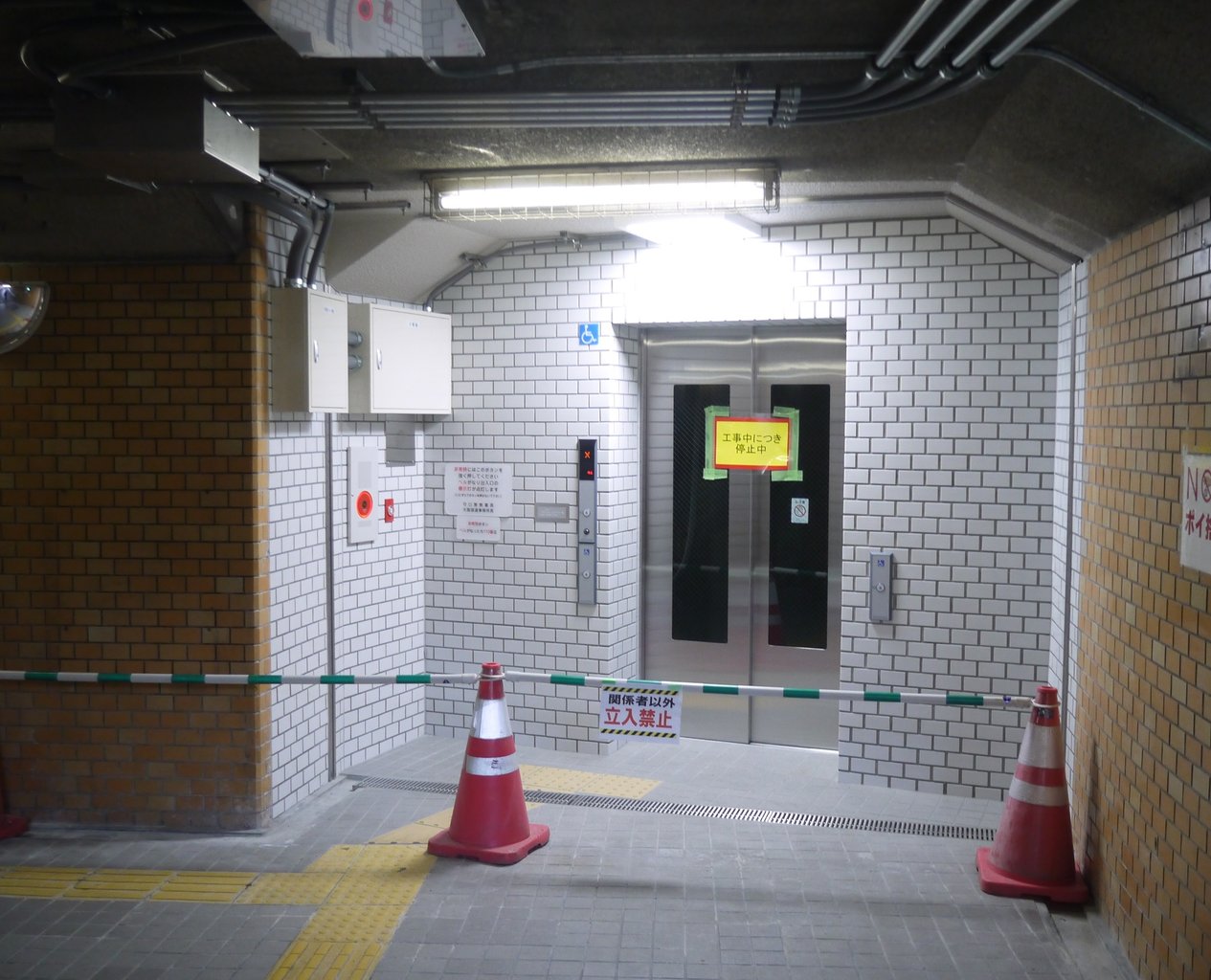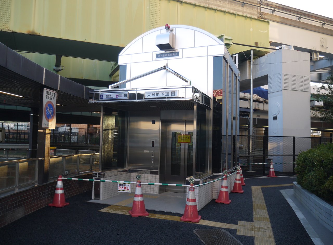 地下鉄谷町線大日駅(府道13号線・中央環状線の大日交差点)の地下道で設置工事が行われていたエレベーターが、完成した状態になっています。