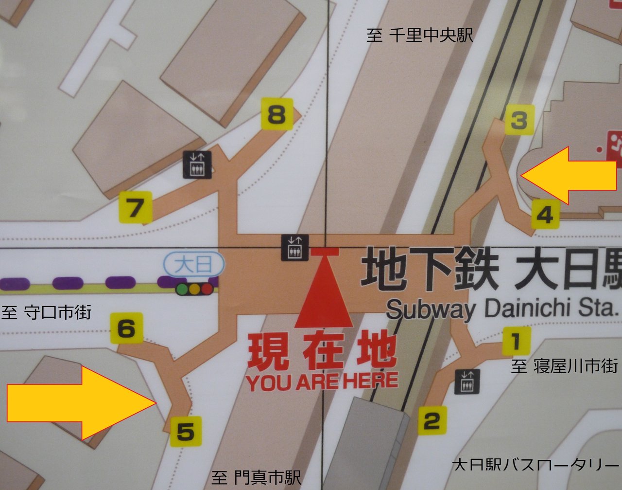 これまで大日地下道と地上を結ぶエレベーターは2基のみ(1・2号出口、7・8号出口)でしたが、新たに3~4基目(下の矢印の部分)が増設された形です。