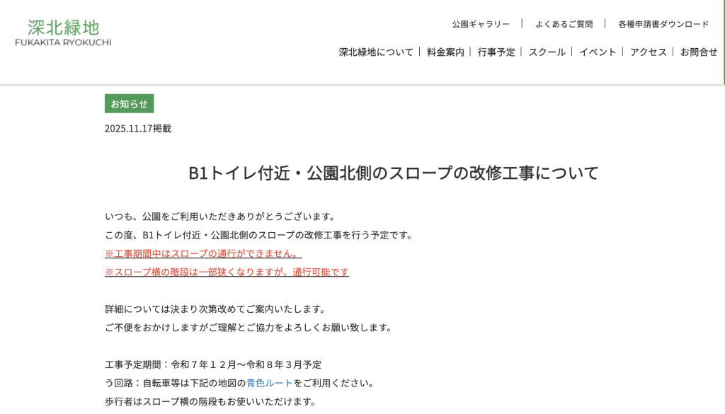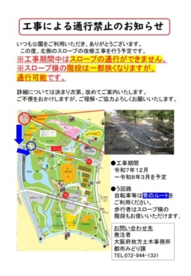 上記によると、工事期間は12月から2026年3月までの予定みたい。工事期間中はスロープの通行はできないですが、スロープ横の階段は通行可能のようです。