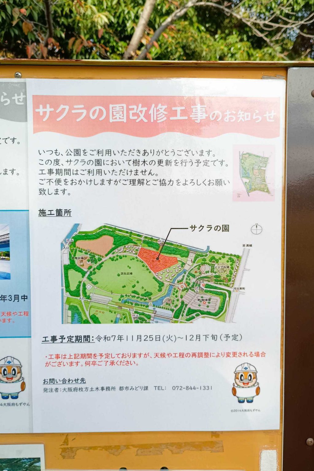 深北緑地の「サクラの園」「B1トイレ付近・公園北側のスロープ」で改修工事をするようです。