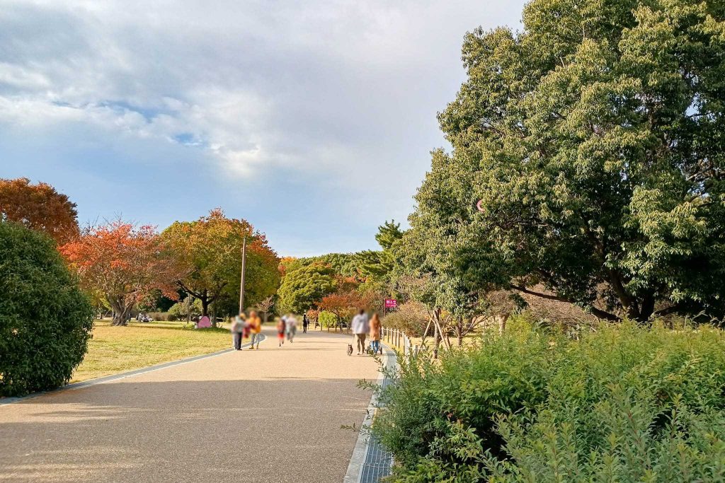 右側がサクラの園で、道を挟んで左側が芝生広場です。