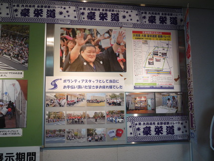 寝屋川市立体育館のロビーに、10月16日に寝屋川駅前線で行われた豪栄道関優勝パレードの写真が展示されています。