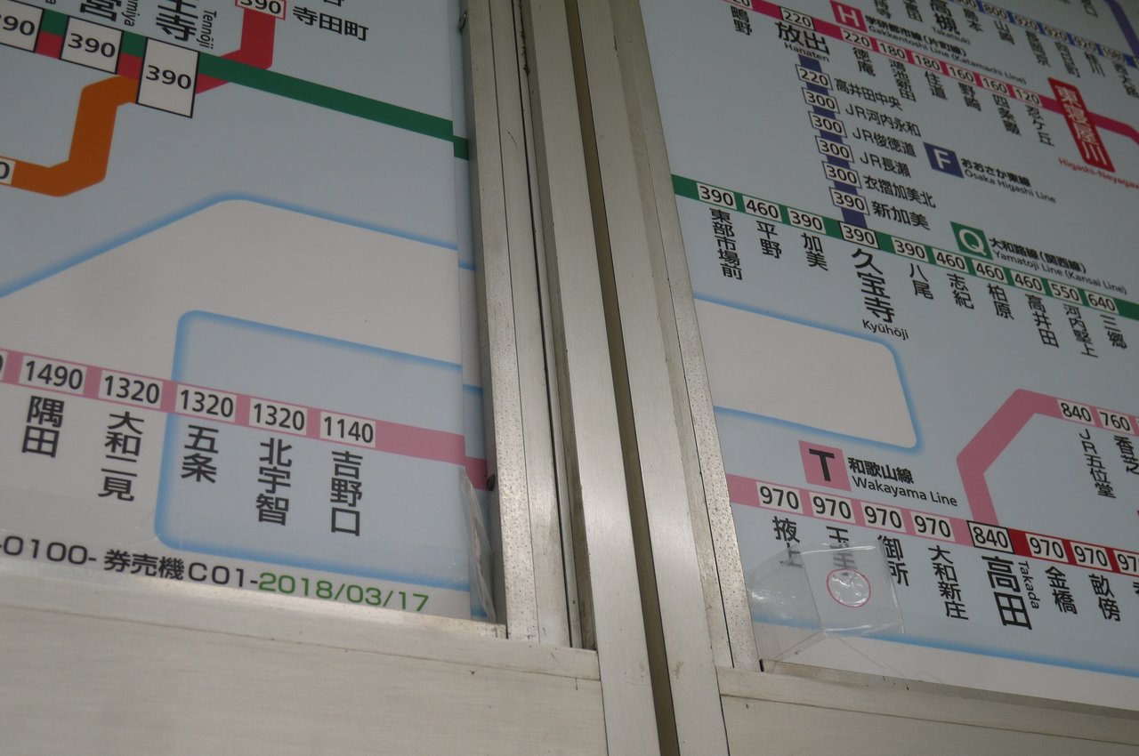 ビニールテープで固定された現在の運賃表をはがすと、新しい駅名やおおさか東線の新しい開業区間(放出駅~新大阪駅)の入った運賃表が姿を現すようです。
