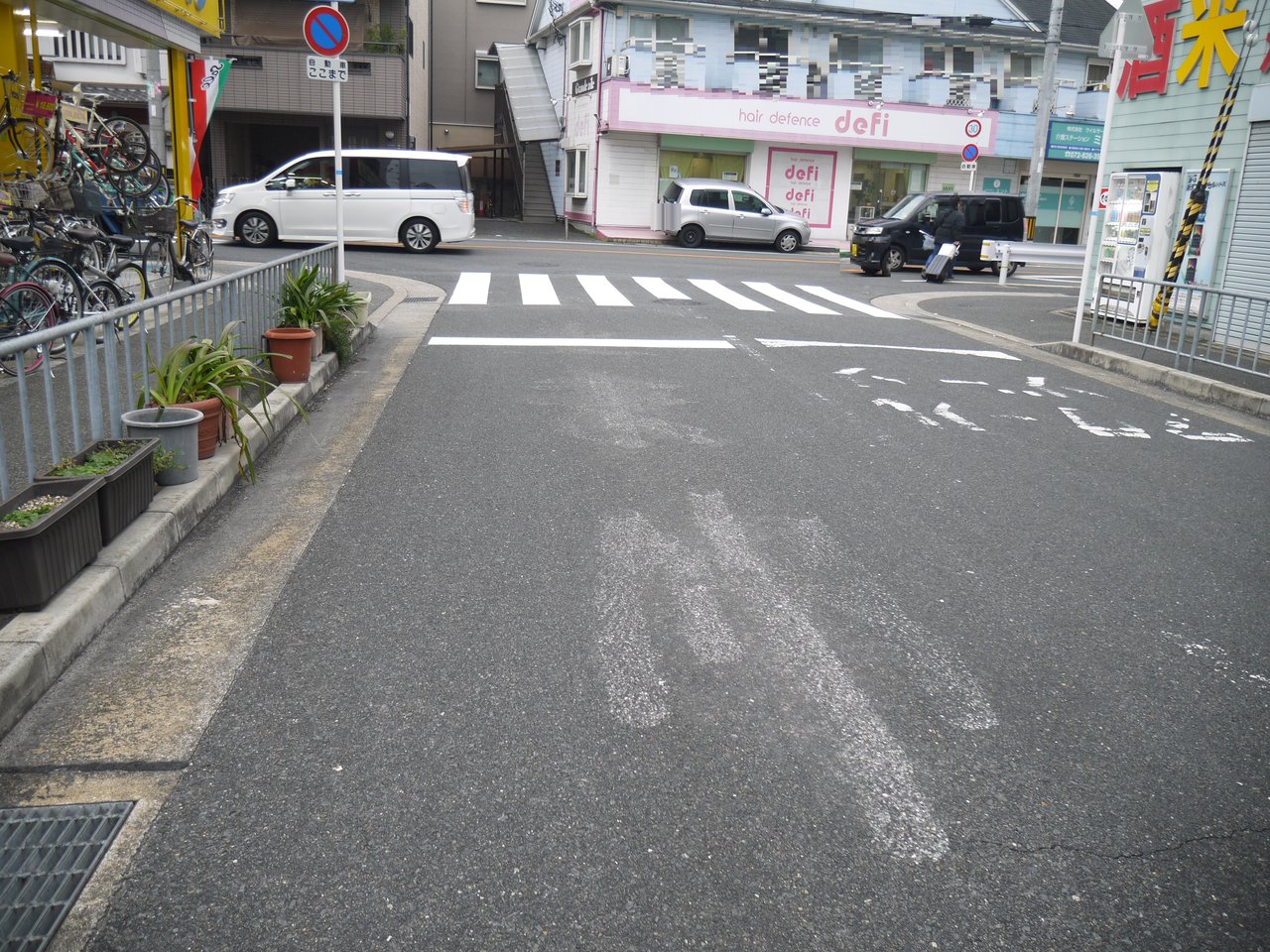 場所は府道の山善サイクルと大阪厚生信用金庫寝屋川支店の間から府営池田住宅や葛原新町方面(同右)へ行く交差点です。