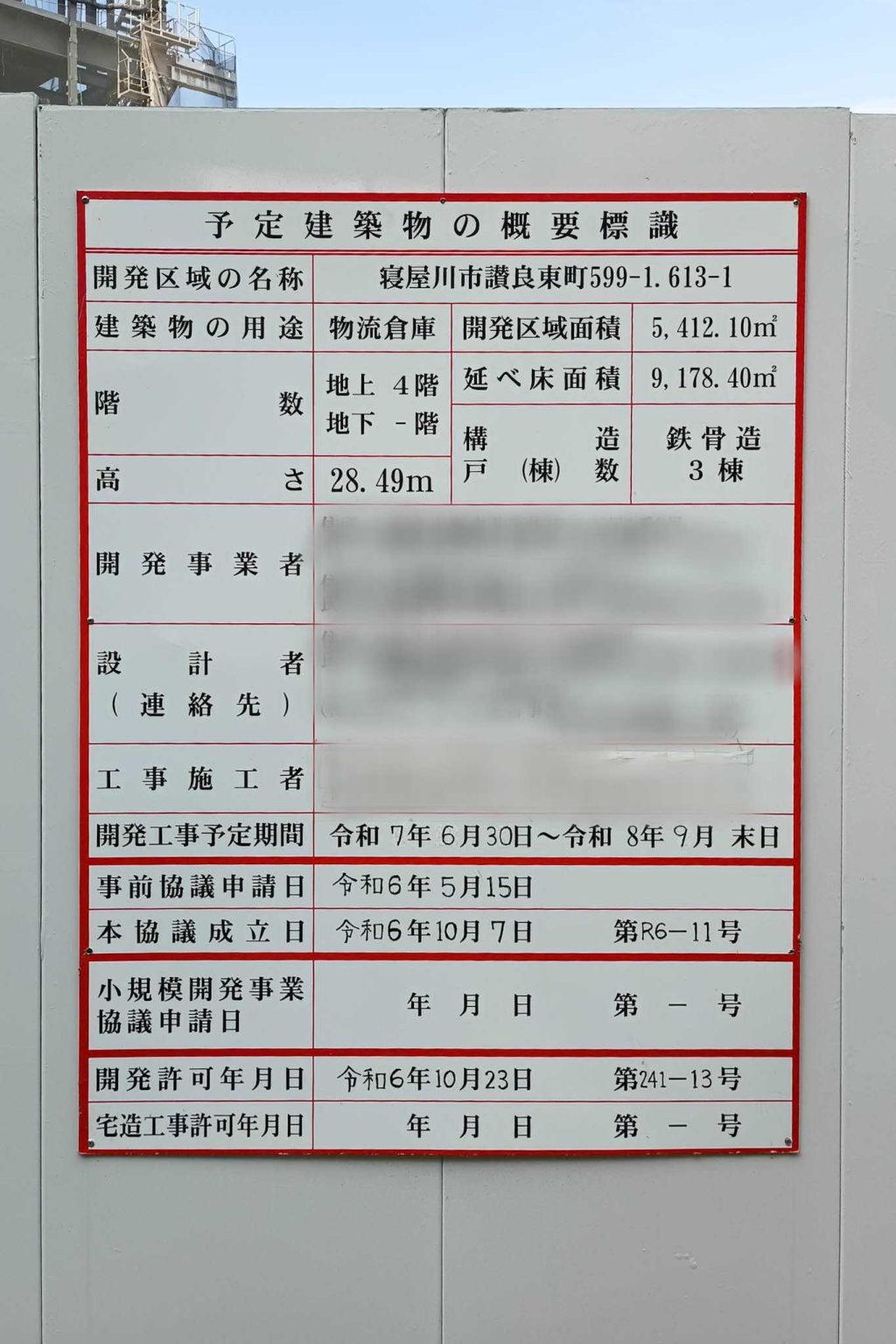 予定建築物の概要標識を見ると、工事予定期間は2026年9月末日まで。物流倉庫が3棟できるようです。
