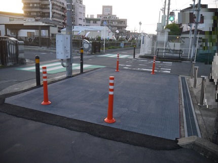 本復旧したのか、あるいはまだ仮復旧の状態なのかは分かりませんが、用水路の上に大きな鉄板が被せられているのが分かりますね。歩道の上に重いトラックが停車することのないようにゴム製のポールも設置されました。
