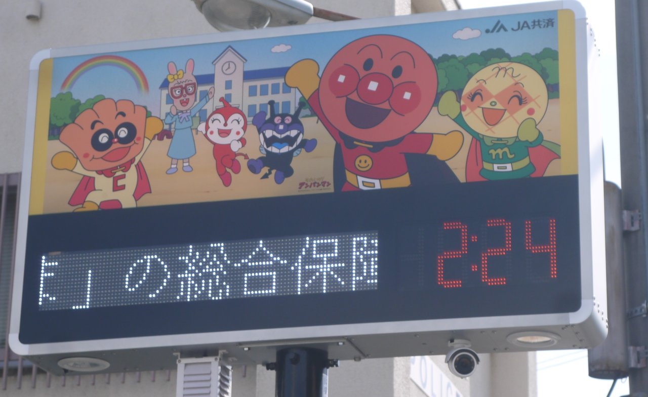 高柳1丁目の「JA九個荘」の駐車場にアンパンマンの絵柄の入った電光掲示板が設置されているのを見つけました。