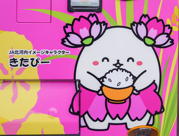 自販機にはレンゲの花をイメージしたピンク色の本体に、稲と米俵とキャラクター「きたぴー」が