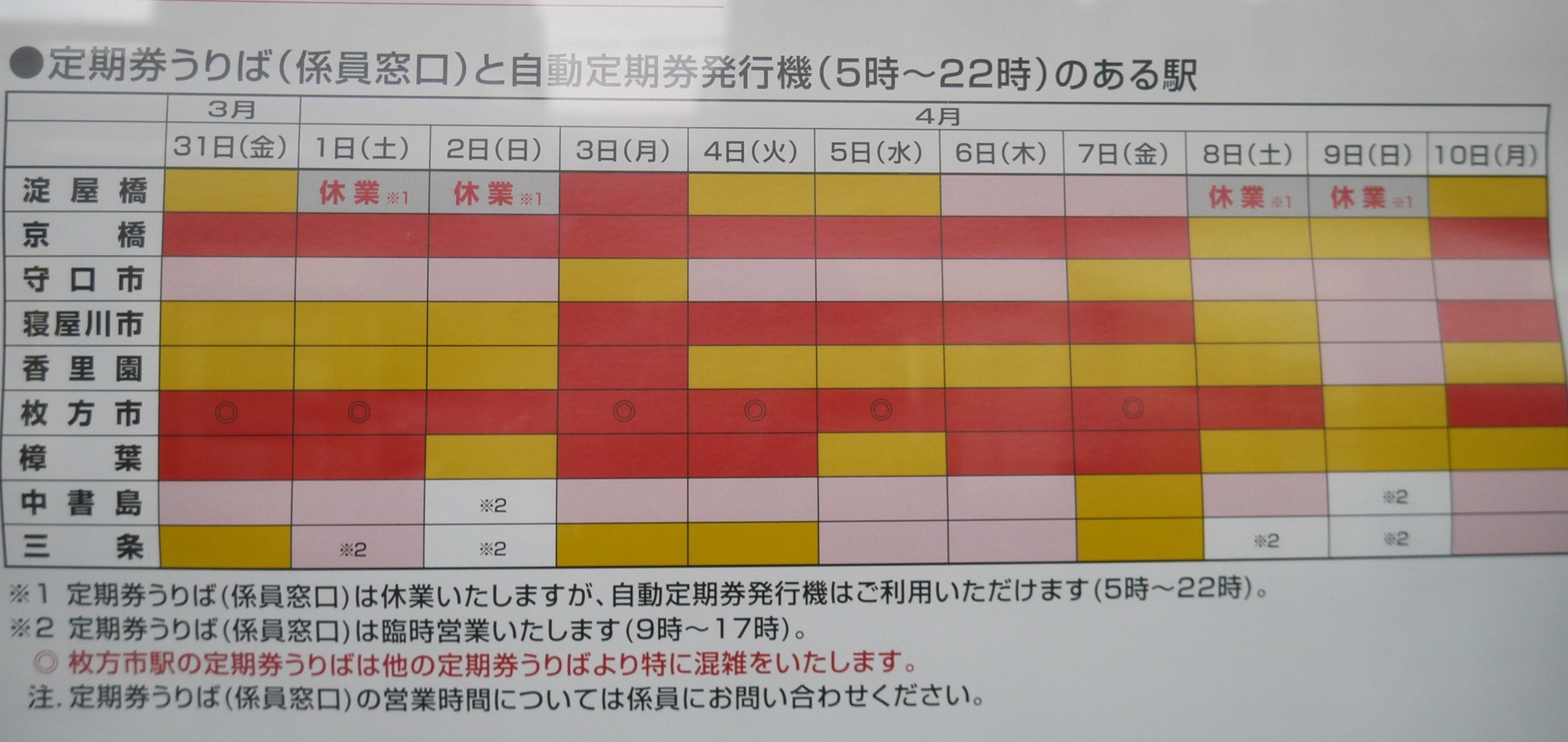 新年度が始まり、今年も寝屋川市内の駅にある定期券売り場の混雑が予想されています。