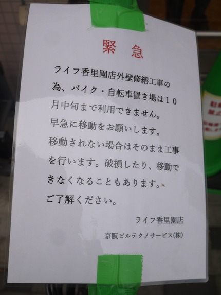 香里新町にあるスーパー「ライフ香里園店」の駐輪場が10月中旬まで使用できなくなるみたいです。